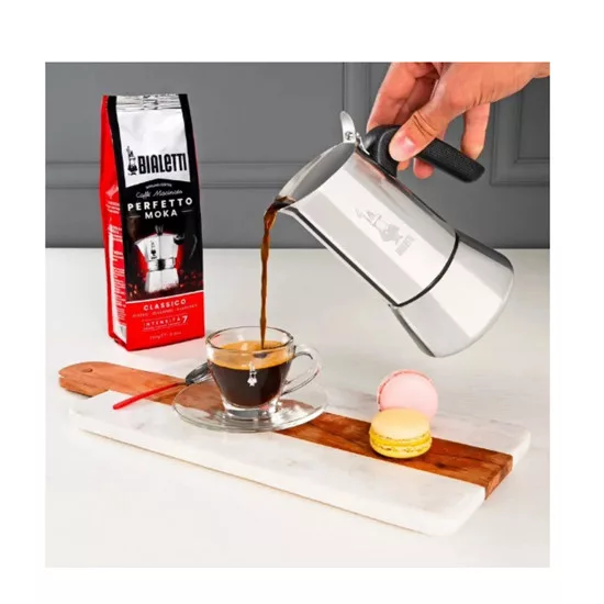 A praktikus, csepegésmentes kiöntőcsővel ellátott funkcionális stílus, rozsdamentes acélból készült, ergonomikus, hőálló fogantyúval és gombokkal, valamint Bialetti szabadalmaztatott biztonsági szeleppel rendelkezik.
