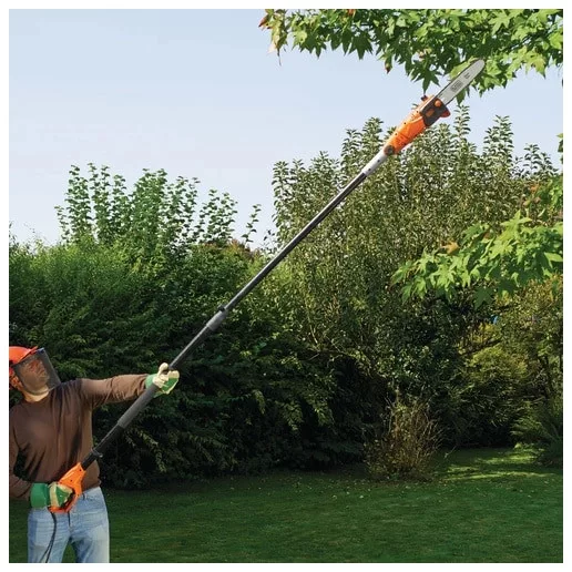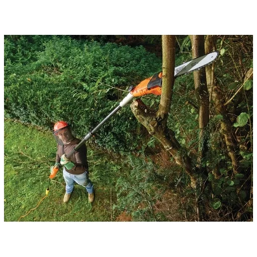 Kiterjesztett elérés - Az ágazófűrész hossza 2,7 m-ig van kiterjesztve a magasan elhelyezkedő ágak elérése érdekében.