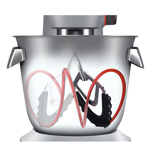 - Tökéletes eredmények, hála a 3D bolygómozgásnak, mivel semmi sem marad a keverőtál szélén. A nagy, 5,5 literes fém keverőtál megkönnyíti az előkészítést, a fogantyúk pedig a mozgatást.