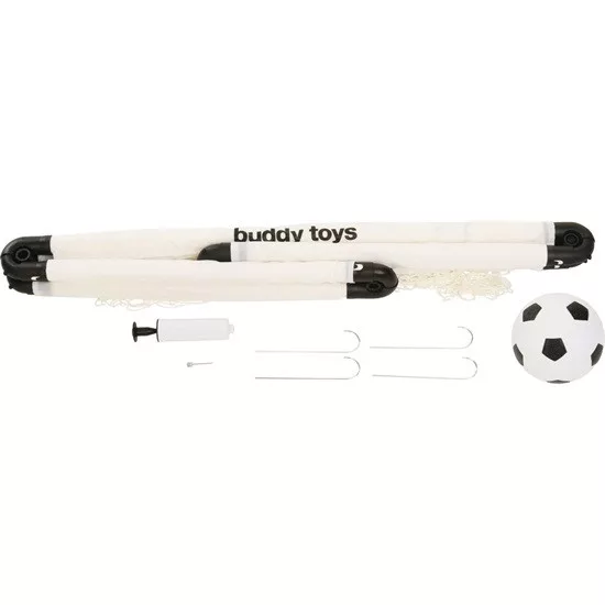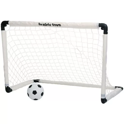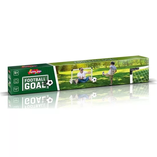 A csomag tartalmaz egy futballkaput, egy kis felfújható labdát, és egy rögzítést a fűben.