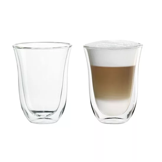 • DeLonghi 330 ml-es Latte Macchiato pohár boroszilikát üvegből készült, mely a duplafalú megoldással párosulva használható mikrohullámú sütőben, mosogatógépben, hűtőben és fagyasztóban is, így tökéletes választás hideg, ill. meleg italok készítésére és tárolására is