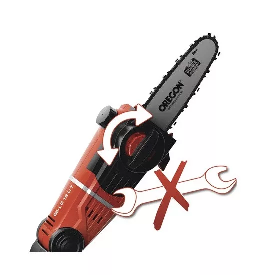 A GE-LC 18 Li T akkumulátoros ágvágó nagy teljesítményű készülék, amellyel magas ágak is könnyen, áramhálózattól függetlenül, a földön állva vághatók le. A fém anyagú hajtómű hosszú élettartamot biztosít, az OREGON minőségi vágó és az OREGON lánc tiszta vágási eredményt ad. A 880 mm és 1840 mm között fokozatmentesen rögzíthető teleszkópos nyél pontosan beállítható a kívánt munkamagassághoz. Az ugyancsak fokozatmentesen állítható kiegészítő fogó praktikus gyorszárral minden felhasználóhoz beigazítható. A 90°-kal elforgatható rátét könnyű, vízszintes vágást biztosít. Magasban végzendő nehéz vágómunka tiszta és pontos végzésére a motorfej 7 fokozatban, a fogó 4 fokozatban dönthető, így bármilyen munkahelyzethez beigazítható. A karmos ütköző megakadályozza a fűrész kicsúszását. Az automatikus lánckenő egy olajtartály segítségével látja el az OREGON láncot a szükséges kenőanyaggal. Szükség esetén a praktikus láncfeszítővel szerszám nélkül állítható és cserélhető a lánc. A láncfogó csapszeg ilyenkor megbízhatóan megakadályozza, hogy lecsússzon a lánc a vágólapról. Az akkumulátor és a töltő nem része a szállítmánynak.