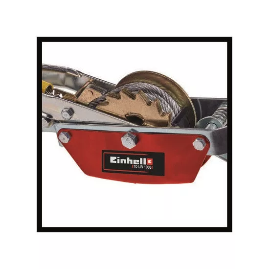 Az Einhell TC-LW 1000 karos kézi csörlő segítségével gyerekjáték az építőanyagok és nehezebb tárgyak mozgatása. A kézi csörlő kizárólag teher húzására vagy rögzítésre használható. Az 1000 kg maximális terhelhetőség és a legfeljebb 1,2 méteres hasznos távolság lehetővé teszi, hogy még a nehéz fatüzelésű kályhákat és konyhai gépeket is könnyedén arrébb mozgassa – fáradtság és hátfájás nélkül! A gyári csomagolás tartalmaz még egy 2,2 méter hosszú, csavarodásmentes drótkötelet (O 4,8 mm), egy terelőgörgőt, valamint egy biztonsági horgot. A biztonsági karabiner megakadályozza, hogy a rögzített teher ki- vagy lecsúszhasson a horogról. A terhet minden egyes húzást követően rögzíti az automatikus fék. A biztonsági rögzítő megakadályozza, hogy a drótkötelet teljesen kihúzhassa a csörlőből. A csörlőt feszítőrugóval szerelték fel, amely segít a kilincsmű kioldásában, és így könnyen kihúzhatja a kötelet. A karos drótköteles csörlőket tilos teher emeléséhez és leengedéséhez használni!
