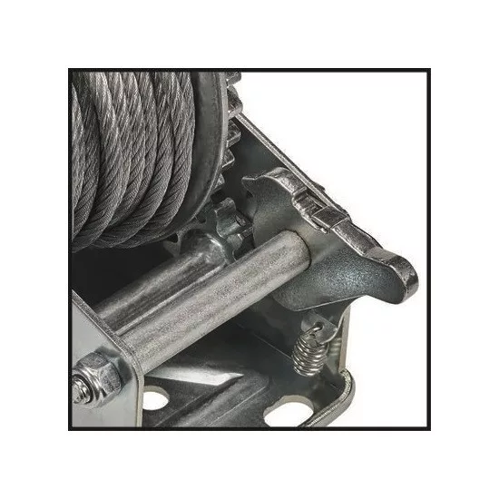 Az Einhell TC-WI 800 kézi csörlő maximális terhelhetősége 800 kilogramm. A gyári csomagolás tartalmazza a 20 méter hosszú, csavarodásmentes drótkötelet (O 4,8 mm) és a biztonsági karabinerrel felszerelt horgot is. A biztonsági karabiner megakadályozza, hogy a rögzített teher ki- vagy lecsúszhasson a horogról. A kilincsmű segítségével biztonságosan megállíthatja a kötelet és a terhet. A kézi hajtókar Softgrip borítású, ami erős fogást és kényelmes munkavégzést garantál. A csörlőt egyszerűen rögzítheti a lemezen található furatok segítségével.