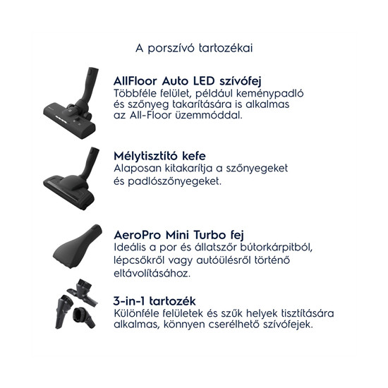 Teljesítményszabályozó: Olyan teljesítménnyel használhatja porszívóját, ami a legjobban megfelel Önnek. Akár a minimumon is, hogy energiát spóroljon.