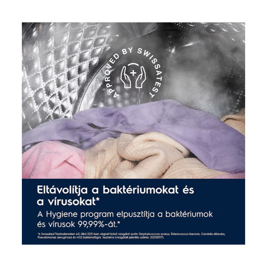 A Swissatest által tanúsított Hygiene program a mosás és a gőz kombinálásával 60°C felett elpusztítja a baktériumok és vírusok több mint 99,99%-át*. A pollenek és allergének mennyisége is csökken, így a ruhák minden mosás után higiénikusan tiszták lesznek.
