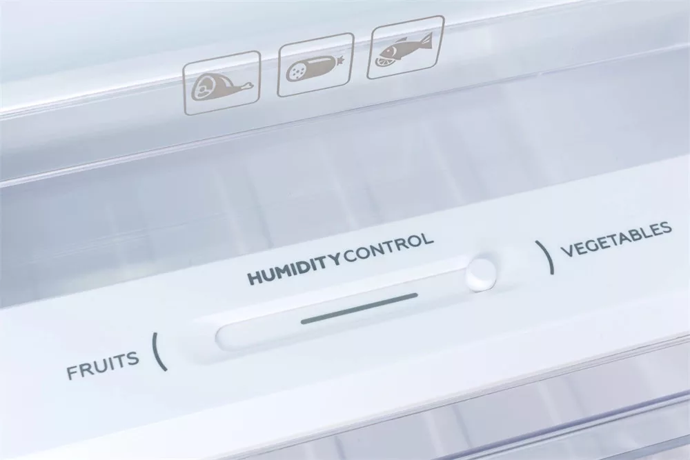 A hűtőszekrény terét 3 biztonsági üvegből készült üvegpolc tagolja, aminek köszönhetően mindig áttekinthető lesz, 2 terjedelmes átlátszó fiók szolgál majd a gyümölcsök és zöldségek tárolására. A hűtőszekrény FRESH zónával is rendelkezik a friss hús és hal tárolására. A tárolóhelyet az ajtón 4 praktikus rekesz egészíti ki, melyek alkalmasak pl. tej tárolására.