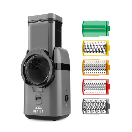 Elektromos reszelő 5 cserélhető tartozékkal reszeléshez és szeleteléshez, DC motor. Kompakt méret, könnyű használat