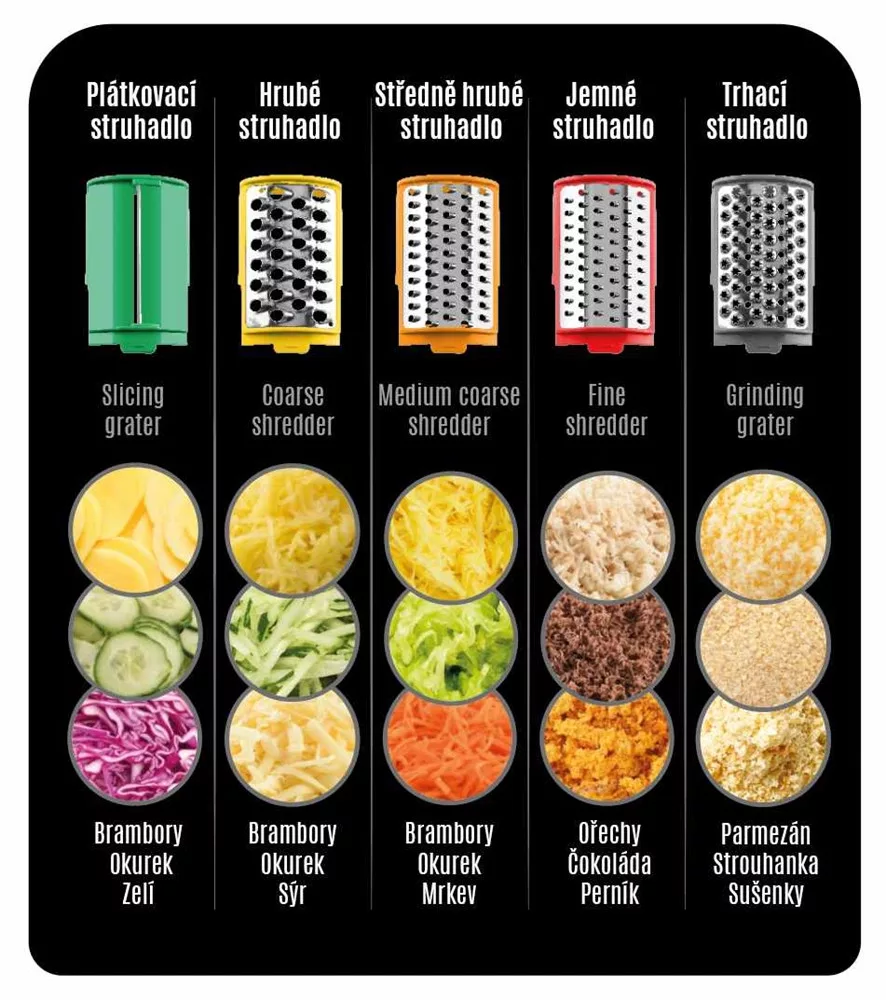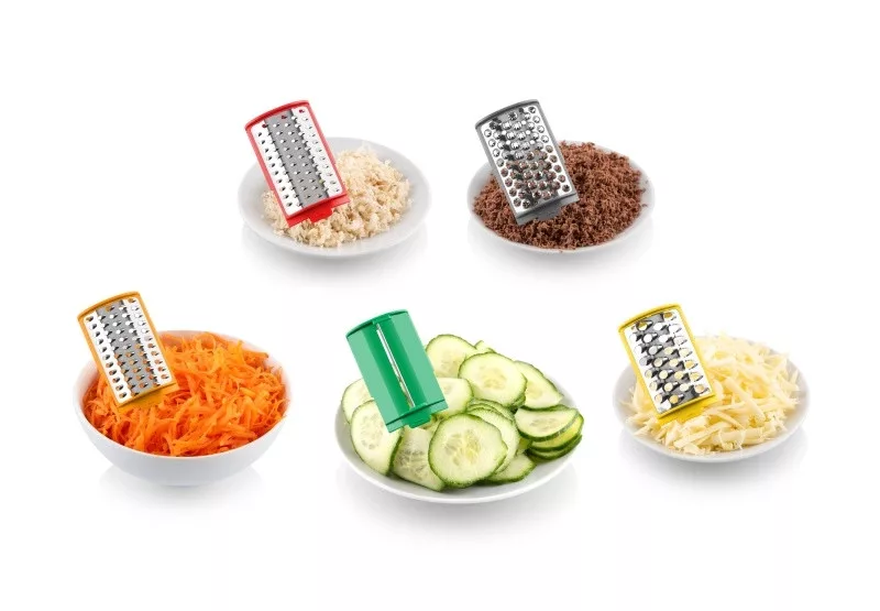 • 5 cserélhető tartozék különböző élelmiszerek reszeléséhez és szeleteléséhez