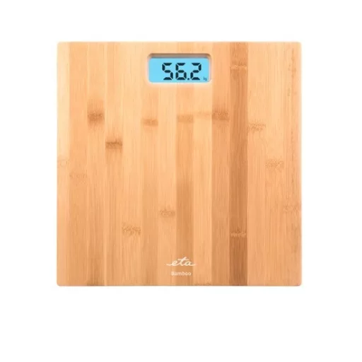 Az ETA Bamboo személymérleg bambusz fából készült mérő felülettel rendelkezik. 180 kg maximális kapacitással és jól látható LCD kijelzővel bír, amelyen a mért érték 100 gramm pontossággal jelenik meg. A méréshez lehet kg, font, vagy stone egységeket kiválasztani. A mérleg fel van szerelve automatikus kikapcsolással, túlterhelési indikátorral és gyenge elem indikátorral. Csúszásgátló lábai nagy stabilitást biztosítanak bármilyen felületen. Az ETA Bamboo mérleg 3 db AAA típusú elemmel működik, amelyek a csomagolásban megtalálhatók.