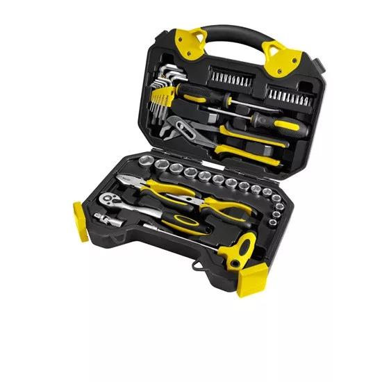 A készlet 54 részből áll - 3/8” racsnis kulccsal, 7 - 24 mm fejekkel, CR-V minőségben. A készlet tartalmaz továbbá diagonális és hosszabbító hajtószárat, valamint csőfogókat, de megtalálható benne imbuszkulcs és csavarhúzó készlet is. Az eszközök ergonomikus tervezésű, egyoldali fogantyúval ellátott műanyag táskában érkeznek. Az egyoldali fogantyú elhelyezés biztosítja, hogy a táska csak a megfelelő oldalon nyitható, így a készlet tartalma nem hullik ki a nyitás során.