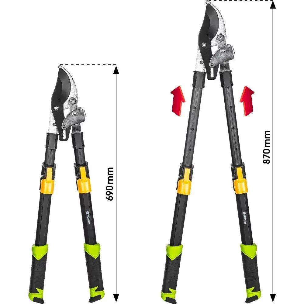 A 690–870 mm között állítható teleszkópos nyél nagyobb hatótávolságot biztosít, így a magasabban lévő ágak is könnyebben elérhetők. A hosszabb karok hatékonyabb erőátvitelt eredményeznek, így akár 40 mm átmérőjű ágak vágása is kontrolláltan végezhető. A szénacél penge éles és tartós megoldást kínál rendszeres metszési munkákhoz. Az erősített alumínium fogantyú stabilitást biztosít, míg a gumírozott markolat kényelmes és biztos fogást ad. A 1,57 kg-os tömeg kiegyensúlyozott kezelhetőséget eredményez hosszabb használat során is.