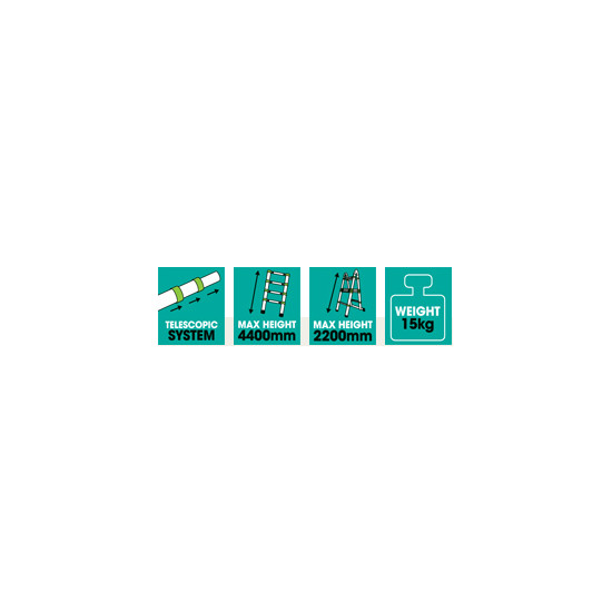 A létra egyedülálló teleszkópos rendszerének köszönhetően nagyon népszerű a ház- és kerttulajdonosok körében. A létra minimális helyigénnyel dicsekedhet, összecsukott állapotban 90 x 49 x 18 cm helyet foglal, a kezelése könnyű és kényelmes. Speciális konstrukciója és a megfelelően kiválasztott anyagok gondoskodnak nagy stabilitásáról teljesen kihúzott állapotban is, maximum 150 kg megterhelést bír, 4,4 m-ig húzható ki mint létra és 12,2 m-ig, mint dupla létra.