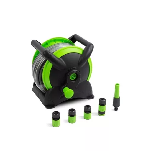 Ez a kerti öntözőszett a legtöbb háztartás igényét tökéletesen kielégíti. A szett tartalma a 15 méter hosszú slagon és tárolódobon kívül, a kényelmes használatot biztosító locsoló sugárcső, csapcsatlakozó és tömlőcsatlakozók (gyorscsatlakozók). A dob, kompakt méretének köszönhetően könnyen hordozható, a gumitömítéssel rendelkező gyorscsatlakozó kuplung egyszerű csatlakozást biztosít már meglévő tömlőkre.