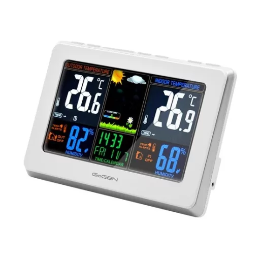 Első pillantásra a GoGEN ME3257 időjárás állomás lenyűgöz nagy és tiszta színes LCD kijelzőjével. Gyakorlati funkció a pontos időjelző, amelyet a DCF 77 rádiójel vezérel . Az ébresztőóra és az aktuális dátum kijelzésével kombinálva az időjárás-állomás gyorsan megtalálhatja a helyét az éjjeliszekrényen.