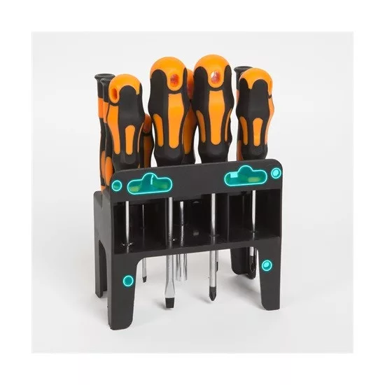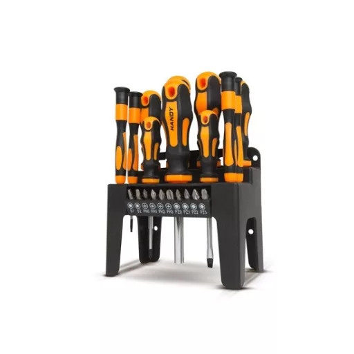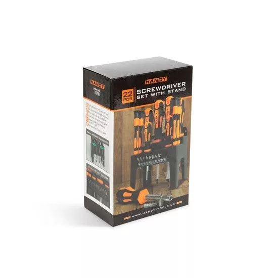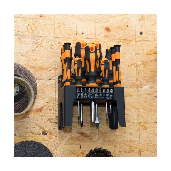 A Handy csavarhúzó készletével könnyedén és gyorsan dolgozhat. A szárak nagy szilárdságú CR-V anyagból készültek, így ellenállnak a kopásnak. Az ergonomikus, csúszásgátló anyagból készült nyél, kényelmes és biztonságos munkavégzést garantál. A fali/asztali tárolónak köszönhetően mindig jól áttekinthetőek a szerszámai.