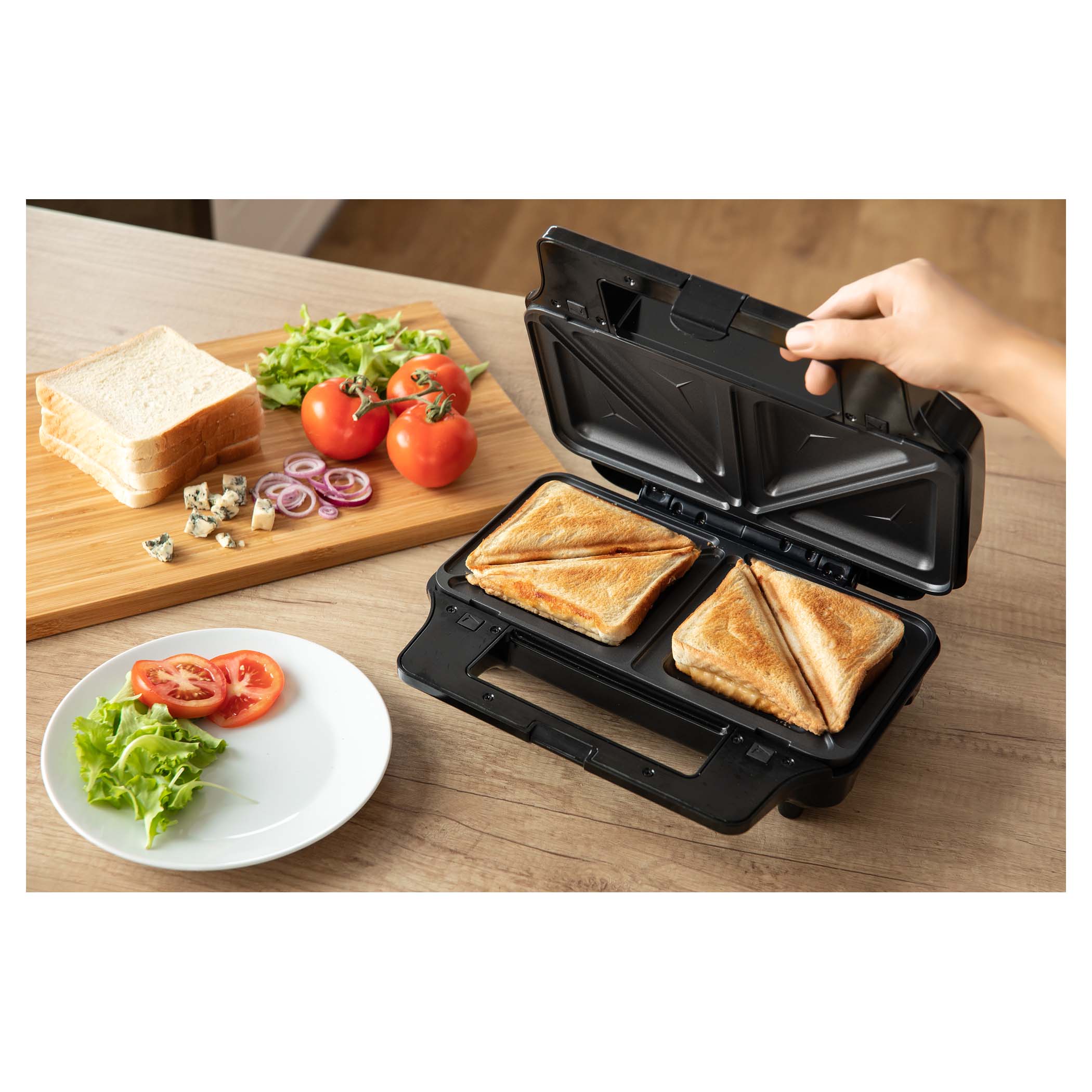 A négy különböző cserélhető sütőfelületen készíthet háromszög alakú melegszendvicset, gofrit vagy akár grillezhet rajta húst is. A Teflon, tapadásmentes felülete révén könnyen tisztítható és nem ég oda az étel.
