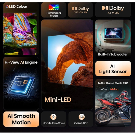 A Hisense TV-k fejlett AI felismerési és kontrasztjavító technológiákkal dolgoznak. Az SDR tartalmak HDR-szerű minőségre javíthatók, tökéletes részletekkel, gazdag színekkel és mély kontraszttal.