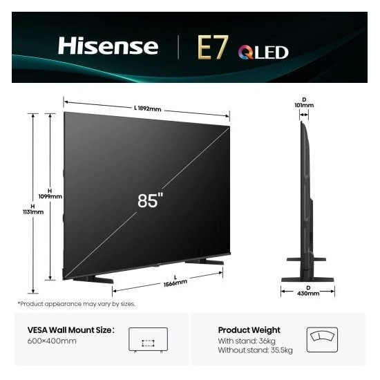 - A televízió szélessége állvánnyal együtt: 1892 mm