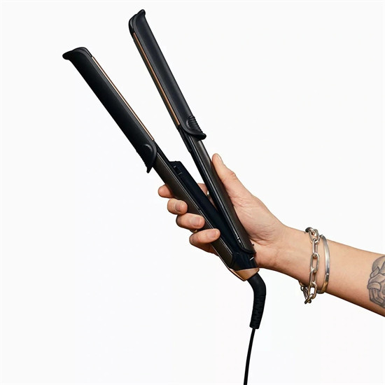 A hajformázó egyenes módba helyezéséhez csúsztasd fel a fedeleket a fogantyúval ellenkező irányban, és oldd ki a hajsimító reteszét, és a simítólapok elkezdenek melegedni. Zárd össze a simítólapokat, és csúsztasd lefelé a fedeleket a fogantyú felé, amíg egy kattanást nem hallasz, így előtűnik a 32 mm-es göndörítő hajsütővas, amely automatikusan aktiválja a göndör módot.