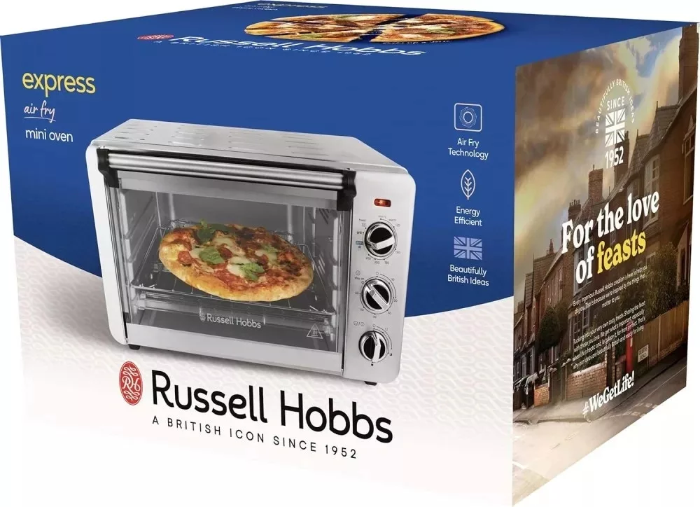 A sokoldalú Russell Hobbs Express Air Fry mini sütővel gyors, egyenletes sütést és tökéletes eredményeket élvezhetsz minden alkalommal. Az 5 funkció közül választhatsz, beleértve a légkeveréses sütést, a hagyományos sütőkhöz képest 4-szer gyorsabb* előmelegítést és az akár 49%-os energiamegtakarítást^, így kedvenc ételeid pillanatok alatt tálalásra készek lesznek.