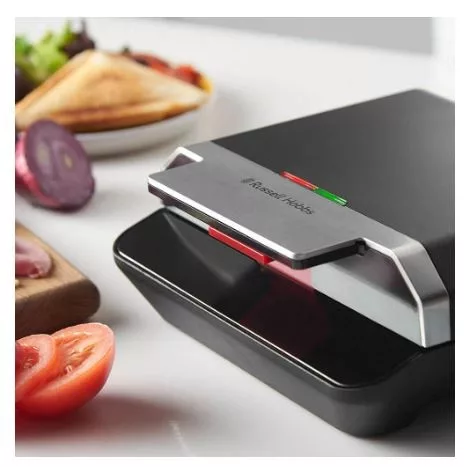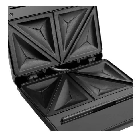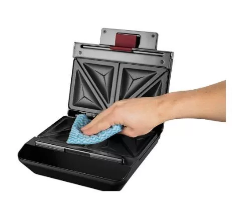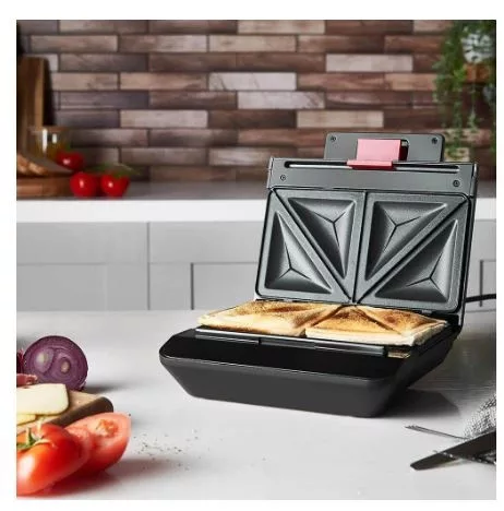 A szendvicssütő mutatós, matt fekete kivitelének és rozsdamentes acél betétjének köszönhetően elegánsan mutat bármelyik konyhapulton.