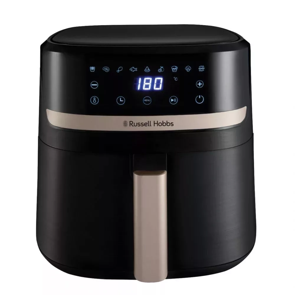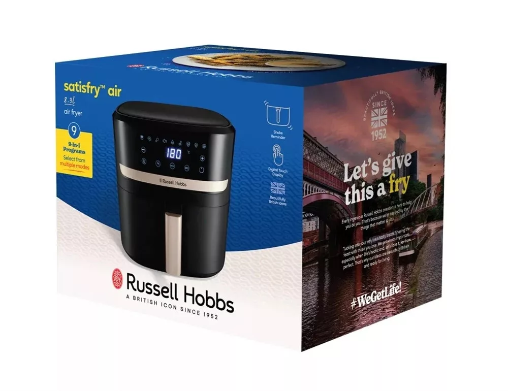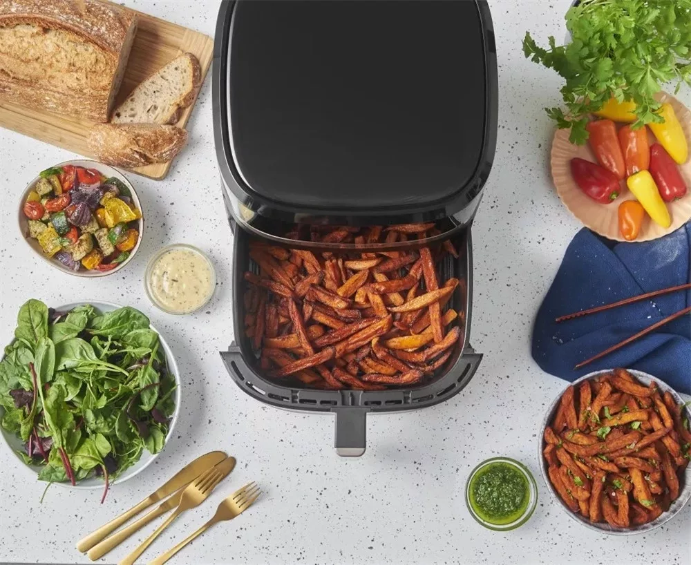 A Satisfry™ 8,3 literes forrólevegős sütő egy valódi mindenes a konyhában. Elég nagy egy egész csirke megsütéséhez vagy több töltött burgonya elkészítéséhez is – így az egész család jól lakik. Mindezt stílusosan: a fekete ívelt burkolat és a divatos pezsgőszínű díszítések igazán elegánssá teszik a konyhapulton. Ha szeretnéd finomhangolni a sütési hőmérsékletet, használd az állítható hőfokszabályzót, ha pedig sietsz, bízd magad a 9 előre beállított program egyikére. Akár a tegnapi vacsorát melegíted újra, akár lazacot sütsz, egy gombnyomással megoldható. A sütőkosár és a grillsütő lap mosogatógépben tisztítható – így a takarítás is gyors és egyszerű.
