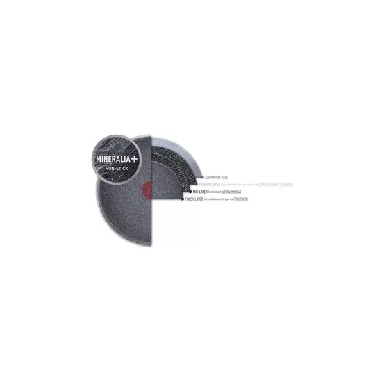 • Mineralia+ tapadásmentes felülettel van ellátva a remek tulajdonságok érdekében és a kis mennyiségű zsírral történő főzéshez, valamint a hosszantartó használat érdekében.