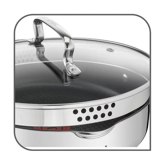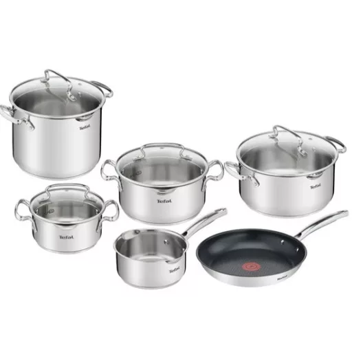 Exkluzív, Tefal Thermo-Signal™ technológia és Titanium X2 tapadásmentes felület (a serpenyőnél), amelyeknek köszönhetően kiváló ételek készíthetők és növekszik az edények élettartama. Az összes típusú főzőlappal kompatibilis Duetto+ rozsdamentes acél edénykészlet és serpenyő azt nyújtja Önnek, amire szüksége van!