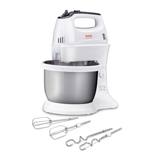 Quickmix kézi mixer forgó tállal és állvánnyal: az Ön nélkülözhetetlen segítsége sütés közben! Fedezze fel a házi készítésű torták és sütemények örömét. A legfinomabb tojásfehérje habtól a süteménymasszák keveréséig és a kenyér- vagy pizzatészta dagasztásáig a Quickmix kézi mixer sokoldalú és nagy teljesítményű konyhai segédeszköz! 5 sebesség beállítást és turbó funkciót kínál a mindig tökéletes eredményekért. Verjen habot megerőltetés és a mixer tartása nélkül a 3,5 l űrtartalmú automatikusan forgó tálnak köszönhetően.