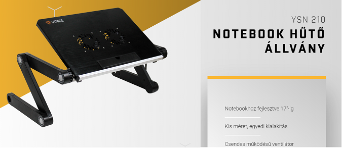 Hűtőállvány notebookokhoz 17" méretig. Alumíniumtest és két 80 mm ventilátor biztosítja a megfelelő hőelvezetést és készüléke optimális hűtését. Az összesen hat elforgatható csukló (360°) lehetővé teszi a notebook optimális helyzetbe állítását munkához vagy szórakozáshoz, és nagy stabilitást biztosít enyhén egyenetlen felületen is.