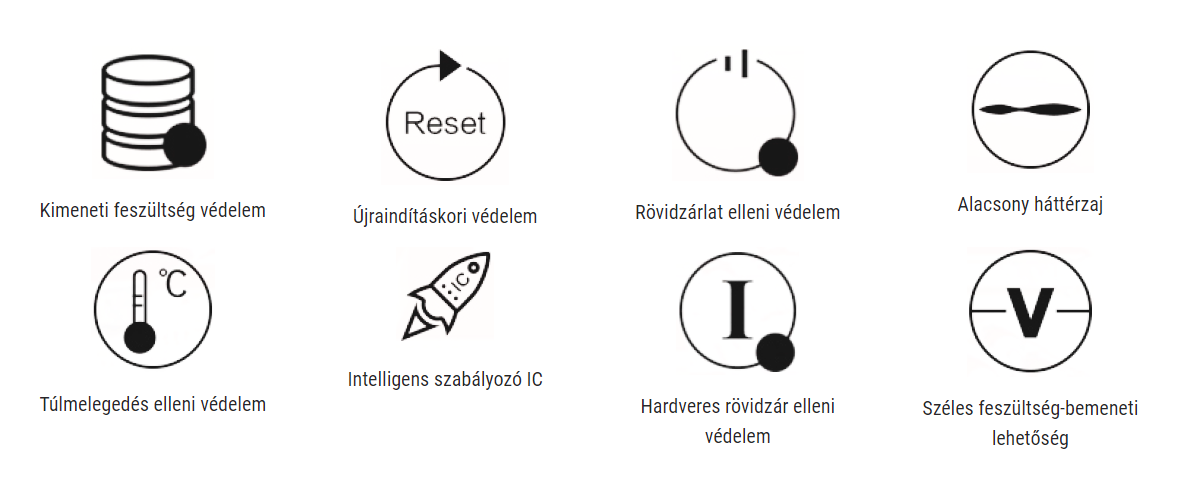 A magas minőségű DC/DC master control chpnek köszönhetően összesen 8 áramköri védelem áll rendelkezésre, miközben a töltési hatékonyság növekedett.