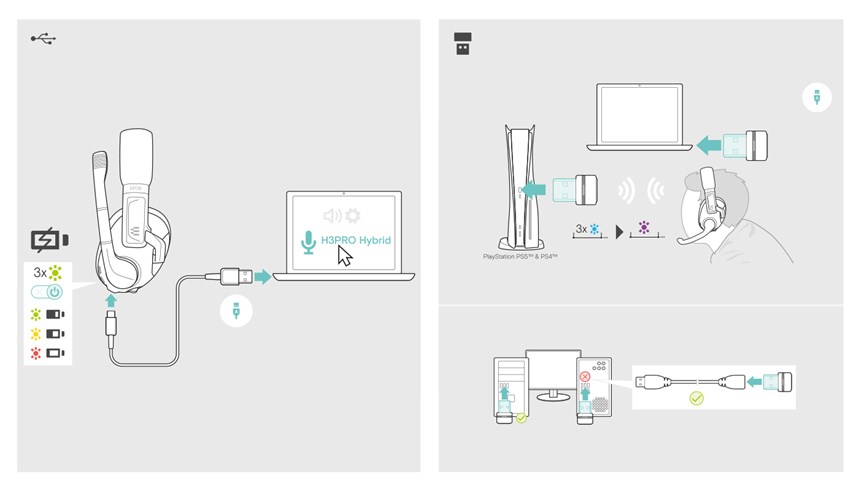 Az H3PRO Hybrid headset alacsony késleltetésű dongle-el történő csatlakoztatásához helyezd a hardverkulcsot a kívánt eszközbe. A headset automatikusan érzékeli a dongle-t, és másodpercek alatt csatlakozik.