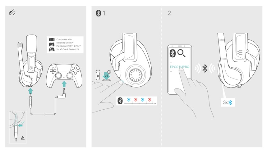 Ha a H3PRO Hybrid headsetet 3,5 mm-es csatlakozóval ellátott eszközhöz szeretnéd csatlakoztatni, használd a 3,5 mm-es jack konzolkábelt (GSA 30 konzolkábel). A H3PRO Hybrid headset Bluetooth® kapcsolaton keresztül történő csatlakoztatásához tartsd lenyomva a párosítás gombot 3 másodpercig, majd a Bluetooth® eszközön a párosítható rendszerek közül válaszd ki az „EPOS H3PRO Hybrid”-et.