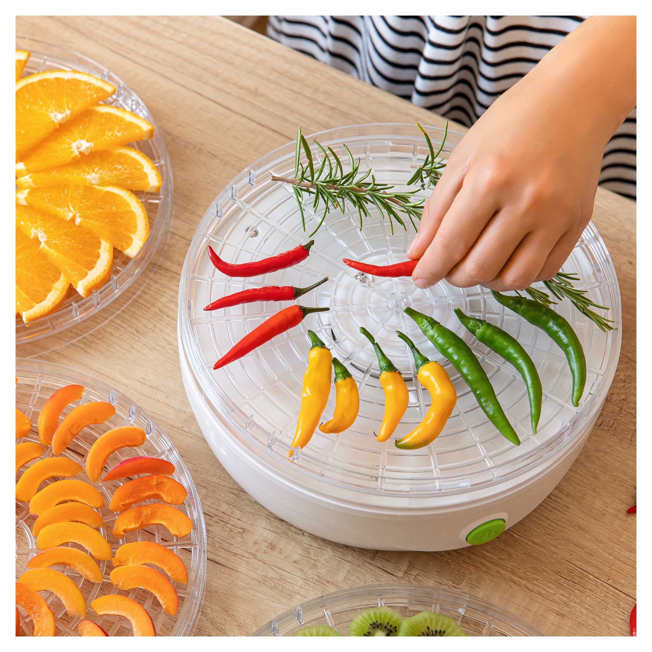 A készülék közepén van egy beépített ventilátor, amely forró levegőt generál fel és oldal irányba, így minden összetevő egyenletesen tud kiszáradni. Ez egy nagyon egyszerű folyamat, amely kevés időt vesz igénybe. A csomagban 5 szárítószitát talál, amelyek speciális rácsszerkezetűek és 23 cm átmérőjűek. A szita a kiválasztott összetevőktől függően akár 3 cm szárítási magasságra is állítható.