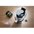 Mi a teendő, ha levet tartalmazó tartály már megtelt, de még mindig van gyümölcs és zöldség a présben? Nem kell lekapcsolnod a készüléket. Csak nyomj rá a kupakot a prés tölcsérére. A lé a belső tartályban gyűlik majd, amíg kiszolgálod a legtürelmetlenebb fogyasztókat és vissza nem helyezed a tartályt.