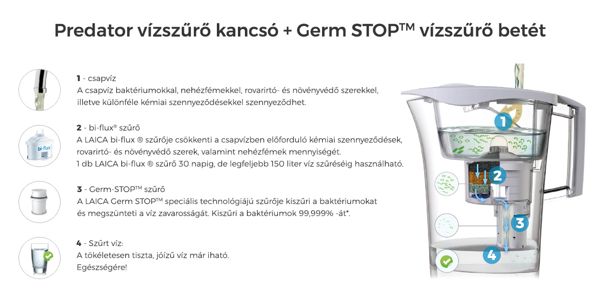 A LAICA Germ-STOP szűrő abból a vágyból született, hogy nagy teljesítményű szűrőt hoz létre annak érdekében, hogy csökkentse a baktériumokat és a legfőbb vegyi anyagokat, amelyek jelen lehetnek azokban az országokban, ahol a vízszennyezés kérdése napi probléma.