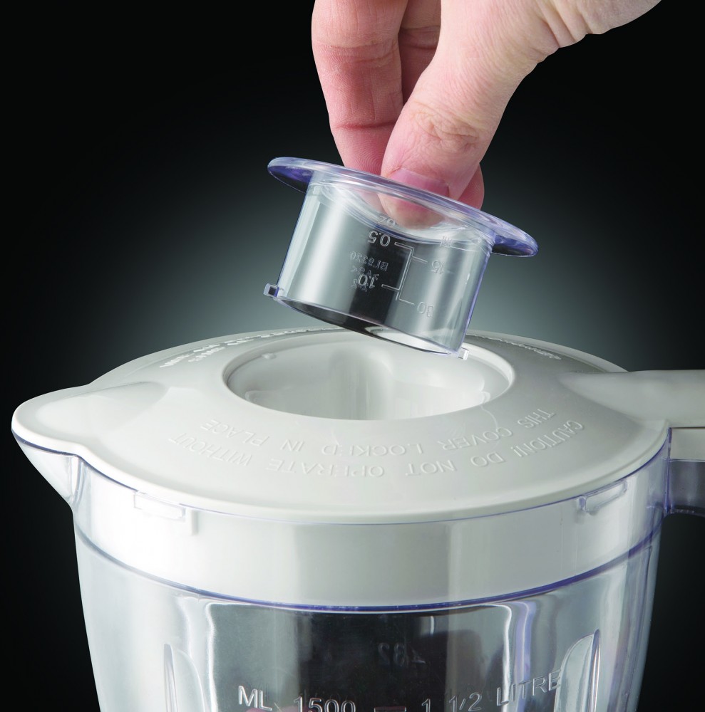 - A 1,5 literes műanyag kehely praktikus adagolónyílással ellátott tetővel rendelkezik.
