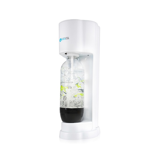 SodaCo R100W Royal Szódakészítő gép, fehér. A SodaCo legújabb, modern megjelenésű szódakészítő gépe. Műanyag, fehér színű háztartási szódakészítő gép. Használatával pillanatok alatt friss, szénsavas vizet készíthetünk. Környezetbarát és takarékos választás, mert nem károsítjuk környezetünket a bolti ásványvizek hazacipeléséből származó sok műanyag hulladékkal. A csomag tartalma egy szódakészítő gép, egy 425 grammos CO2 patron és egy BPA mentes, 1 literes szénsavasító flakon. Egy teli patronnal átlag 60-80 liter szóda készíthető, a szénsavasság mértékétől és a gép típusától függően.