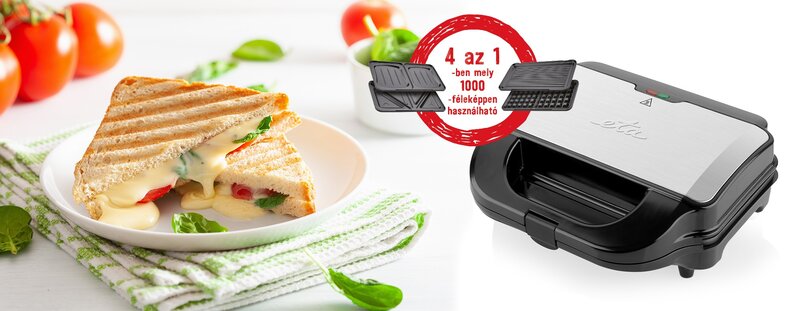 • Szendvics sütő 4 az 1ben - szendvics sütő (háromszögletű lapok), szendvics sütő (négyszögletű lapok), gofri sütő, grill