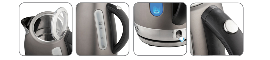 Tápkábel nélküli kivitele és minőségi kontakt rendszere nagy biztonságot és hosszú élettartamát biztosítja. Töltésnél a kétoldalú vízjele segít. Kivehető, mosható szűrője megakadályozza a vízkő letapadását. Biztonsági kidönthető fedéllel, a forráspont elérésénél automatikus kikapcsolási funkcióval és üresjárat, vagy túlmelegedés elleni védelemmel felszerelt.