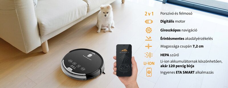 Vigye haza a leghatékonyabb takarítási asszisztenst, az intelligens alkalmazással ellátott ETA Aron 2 az 1-ben robotporszívót, mely nem csak porszívózik, de fel is mos. Belső kialakításának különlegessége, hogy modern digitális motorral rendelkezik extra hosszú élettartammal.
