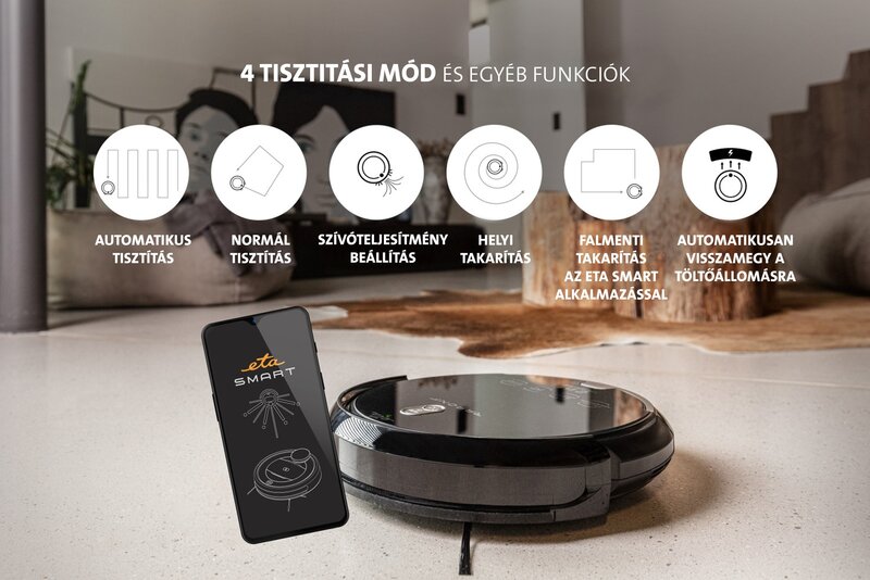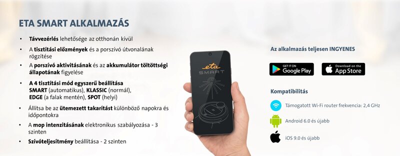 Az ETA SMART alkalmazás nem szükséges az ETA Aron porszívó működéséhez, de segít abban, hogy kibővítse a porszívó funkcióit és tisztítási módjait.