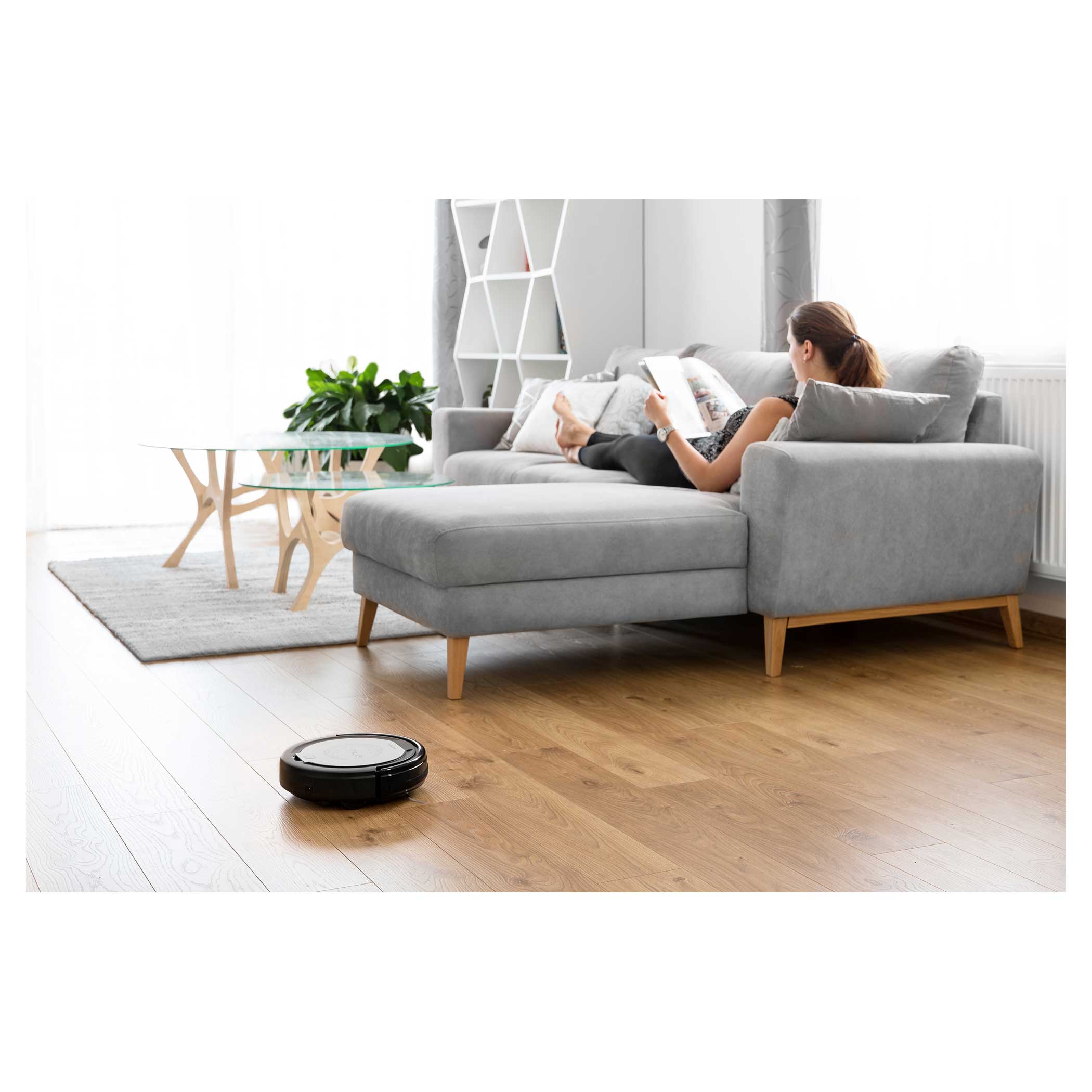 A beépített állítható érzékelőknek köszönhetően, egyszerűen megelőzhető a lépcsőről való leesés. A kerek elakadása esetén automatikusan kikapcsolja önmagát. A működését egy 1500 mAh Li-Ion akkumulátor biztosítja, amellyel a porszívó akár 80 percig is üzemeltethető egyetlen töltéssel.
