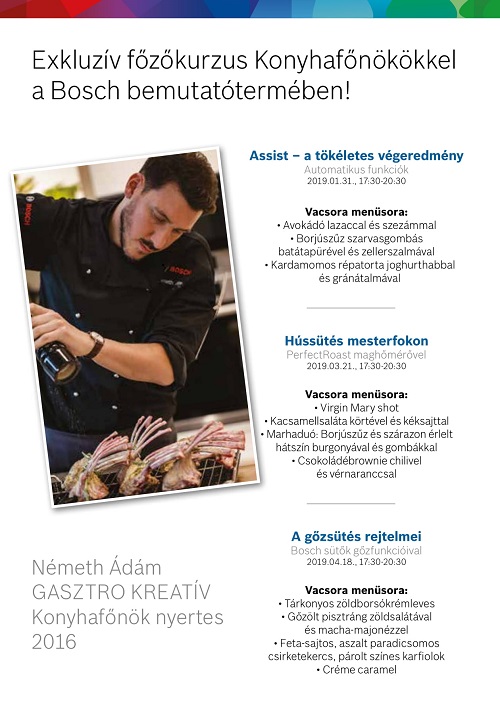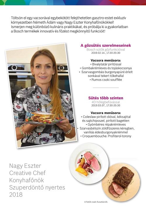 Vásároljon 2019.01.01 - 02.28. között Bosch Serie 8 sütőt, és vegyen részt partnerével egy exkluzív főzőkurzuson Nagy Eszter vagy Németh Ádám Konyhafőnökökkel, akik nemcsak bevezetik Önöket a tökéletes receptek rejtelmeibe, de bemutatják azt is, hogy milyen gasztronómiai csodákra lesznek képesek új Bosch sütőjükkel.