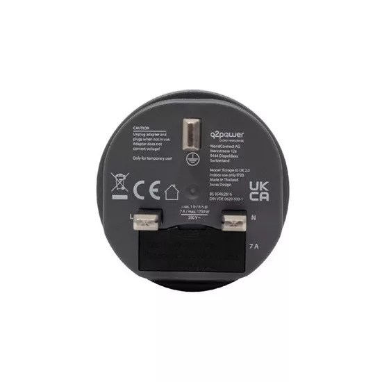 Ez az utazóadapter speciálisan tervezett azoknak, akik Európából az Egyesült Királyságba utaznak, és egy megbízható adapterre van szükségük. A ""Europe to UK"" funkcióval ellátott adapter lehetővé teszi a földelt GS csatlakozós készülékek használatát is. Az adapter kompatibilis az indulás országának GS szabványával, és a célország csatlakozójának UK szabványával. Bemeneti feszültsége 100-250 V, és akár 7 A maximális terhelést is képes kezelni. Teljesítménye 100 V esetén 700 W, míg 250 V esetén 1750 W.