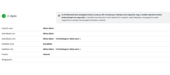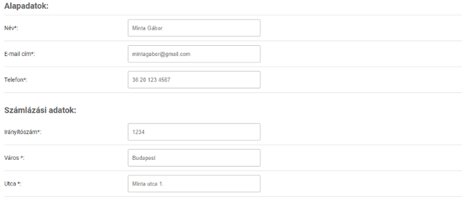 Add meg a nevet és az e-mail címet. Az e-mail cím megadása rendkívül fontos, mivel oda fogjuk kiküldeni a rendelés visszaigazolásáról szóló értesítést, és minden egyéb információt a rendeléssel kapcsolatban. Telefonszámodat a következőképpen add meg: 36 XX XXX XXXX. A számlázási adatokat akkor is meg kell adnod, ha magánszemélyként vásárolsz. Ezek az adatok megegyezhetnek a szállítási adatokkal, de alább módosíthatod is őket.