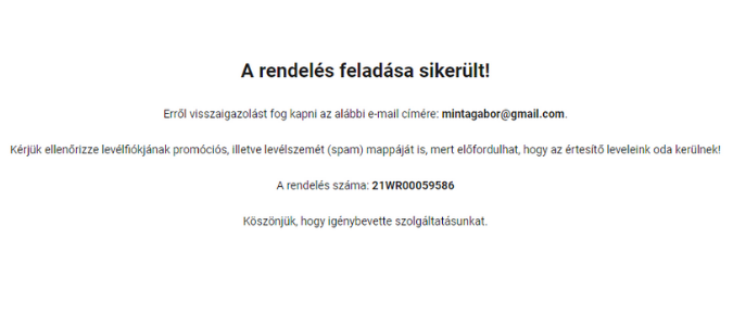 Ezután a rendszer ki fogja írni a rendelésszámot, amit e-mailben is elküldünk. Ha bármi kérdésed van a rendeléssel kapcsolatban, hívj minket ezen a telefonszámon: +36-1/58-58-777.
