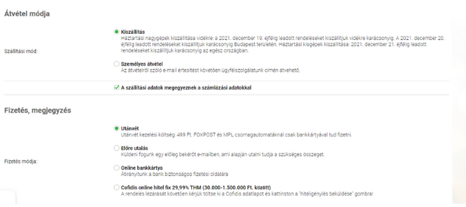A fizetés rovatnál kiválaszthatod, milyen módon szeretnéd kifizetni a rendelést. Ha utánvéttel szeretnél fizetni, akkor arra plusz költséget számol fel a futárszolgálat. A futárnál fizethetsz készpénzzel és bankkártyával is. Ha az előreutalást választod, e-mailben küldünk neked egy díjbekérőt, melyen minden az utaláshoz szükséges adat szerepel. Online bankkártyás fizetés esetén a rendszer átirányít a bankfiók oldalára, ahol fizethetsz. Helyszíni átvétel esetén nem számolunk fel utánvét költséget, amennyiben a helyszínen fizetsz, a végösszeget készpénzzel és bankkártyával is kiegyenlítheted. A Cofidis online áruhitelről bővebben itt tájékozódhatsz: https://www.cofidis.hu/calculatorweb/wcalc_eles/webkalk/leiras/3/index.html
