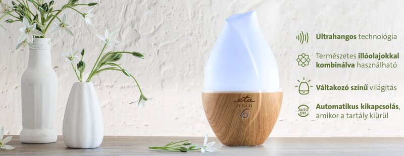 Az ETA Aria aroma diffúzor ötletesen ötvözi az aromaterápia és a párásítás hatásait. Az ultrahangos technológiával illatos gőz keletkezik, amely kellemesen illatosítja a szobát, és ugyanakkor hatékonyan párásítja a levegőt is. A készülék a kényelem mellett, a légutak megtisztításában is segít. Megkönnyebbülést hozhat allergia, az asztma, a hörghurut, a megfázás és más légúti megbetegedések esetén.